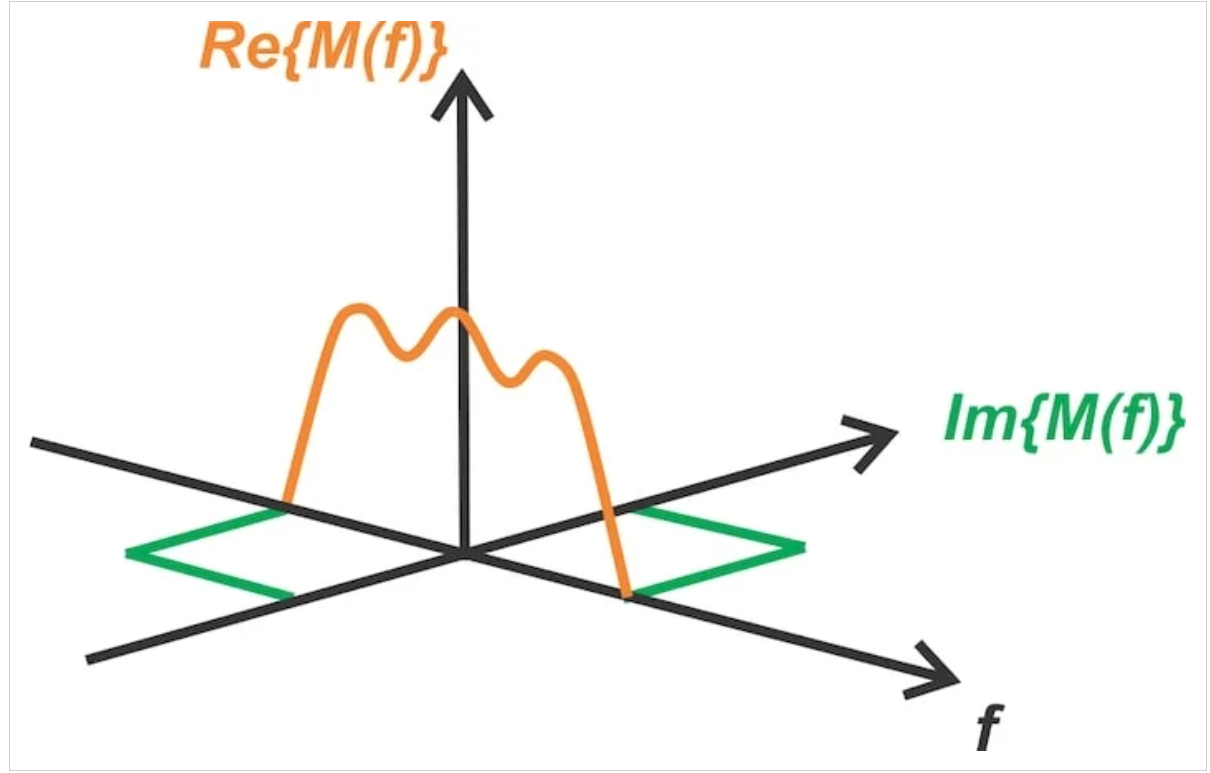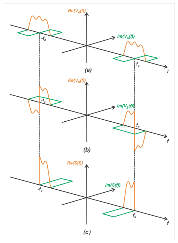 考虑将实值消息信号作为SSB波传输。实值函数的傅里叶变换表现出共轭对称性,这意味着谱的实部是偶数函数,虚部是奇数函数。这在图1的两半中进行了说明。