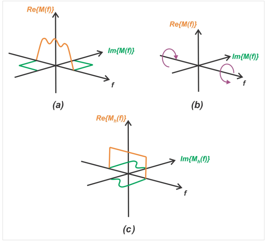 方程6中的第一项将Hilbert变换的输出谱(图3(c)中的Mh(f))移动到ωc的中心,缩放因子为1/2j。除以虚单位j对应-90度的相移,产生图5(b)中输出谱的正频率部分。