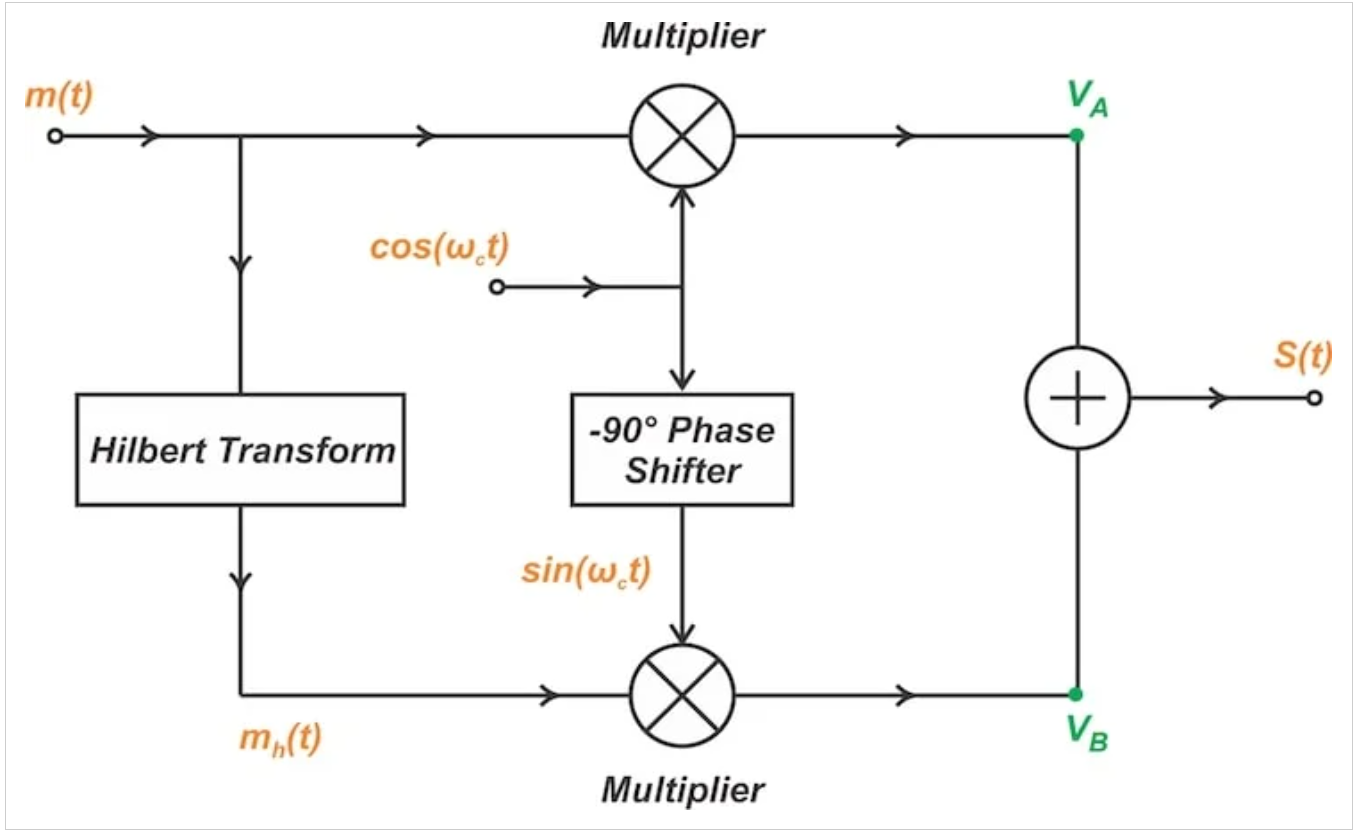 调制器电路通过将节点A和B的频谱相加来产生输出。在这种情况下,这意味着下边带信号。如果我们用减法器替换电路输出端的加法器,它将产生上边带。